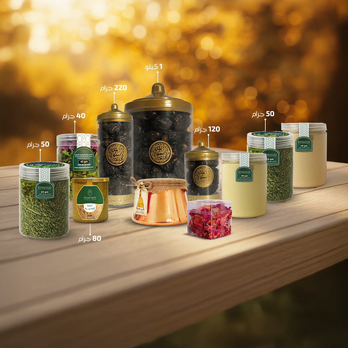 مجموعة خيرات المدينة تضم فوانيس تراثية، أعشاب طبيعية، ورد مديني، سدر، حناء، وشاي مختص، في تشكيل يعكس أصالة المدينة المنورة.